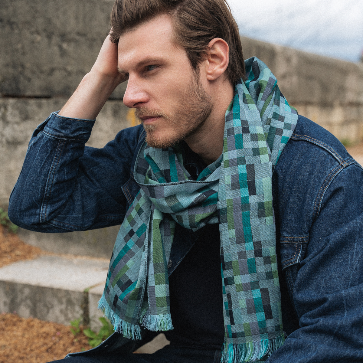 A comfortable, thick men’s scarf of exceptional quality. A very strong, tight weave realized in 100% natural materials. This particular blend of Merino wool, cotton, and silk creates a remarkably soft feel to the touch for this blue sky scarf with a touch of green in an original checkered design. 100% made in Lyon, France.