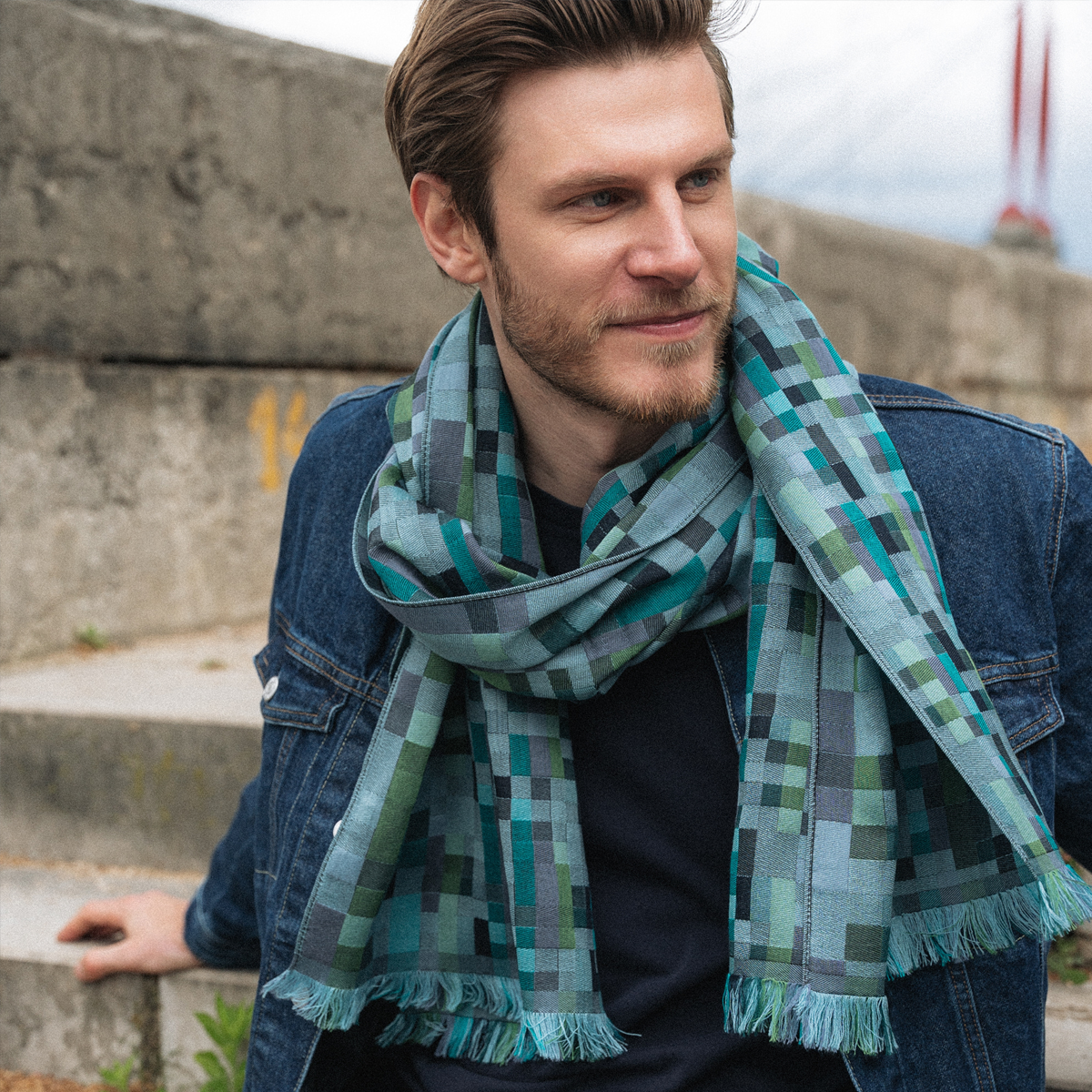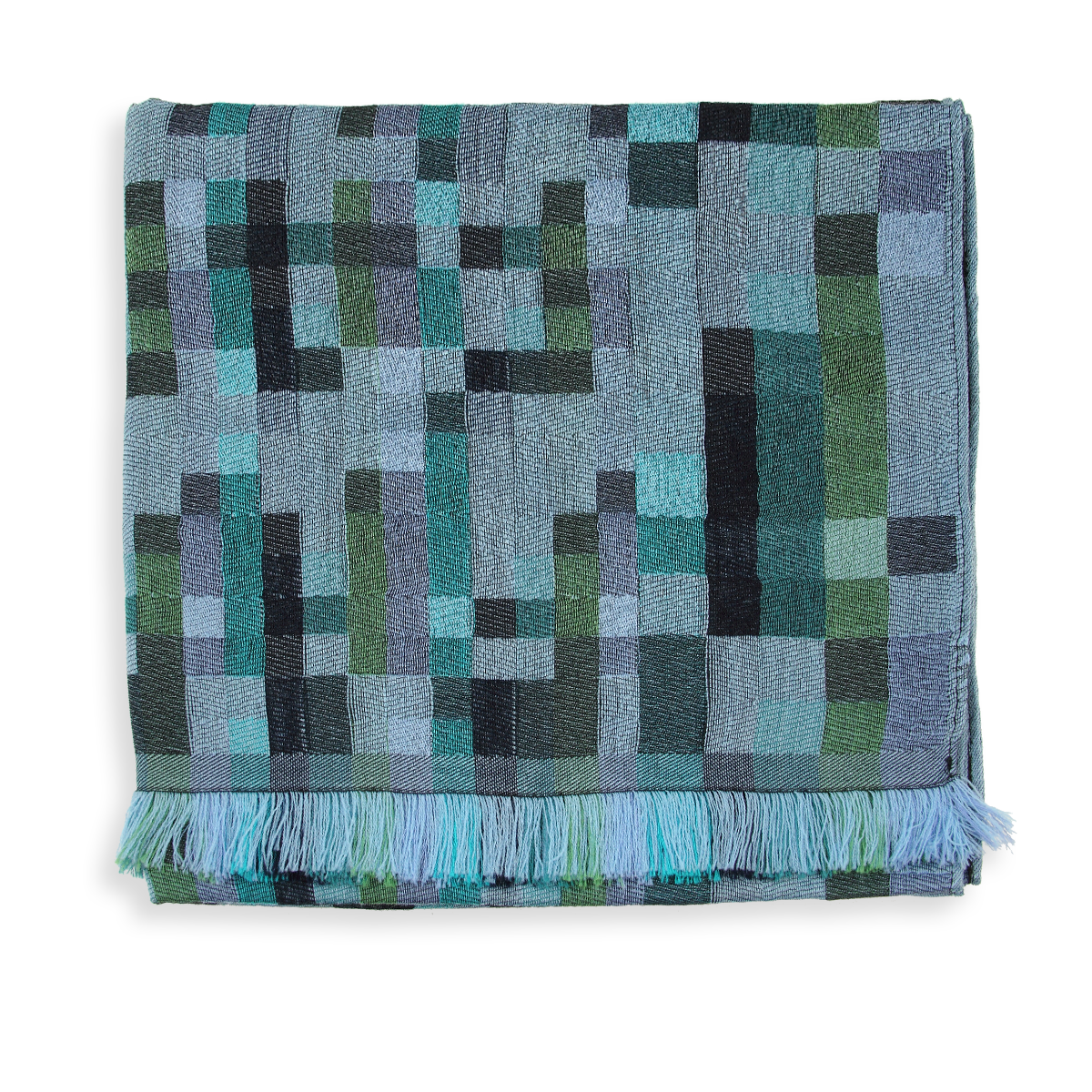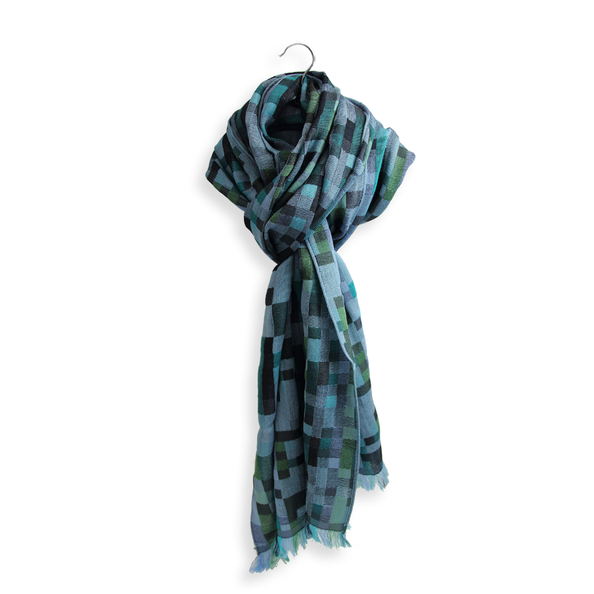 Inspired by the game Tetris, this scarf features checks designed to look like a puzzle, adding a touch of playfulness to your look. Blue sky is the dominant color, with touches of turquoise, green, and marine added in a beautiful harmony of color. An original design from "Fabrique d’Écharpe".