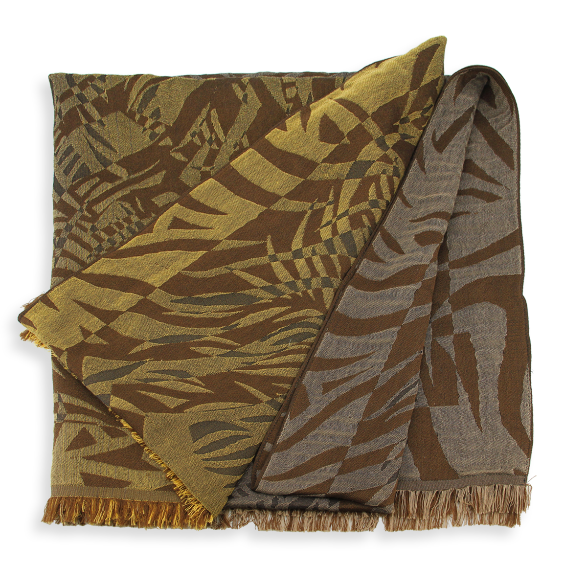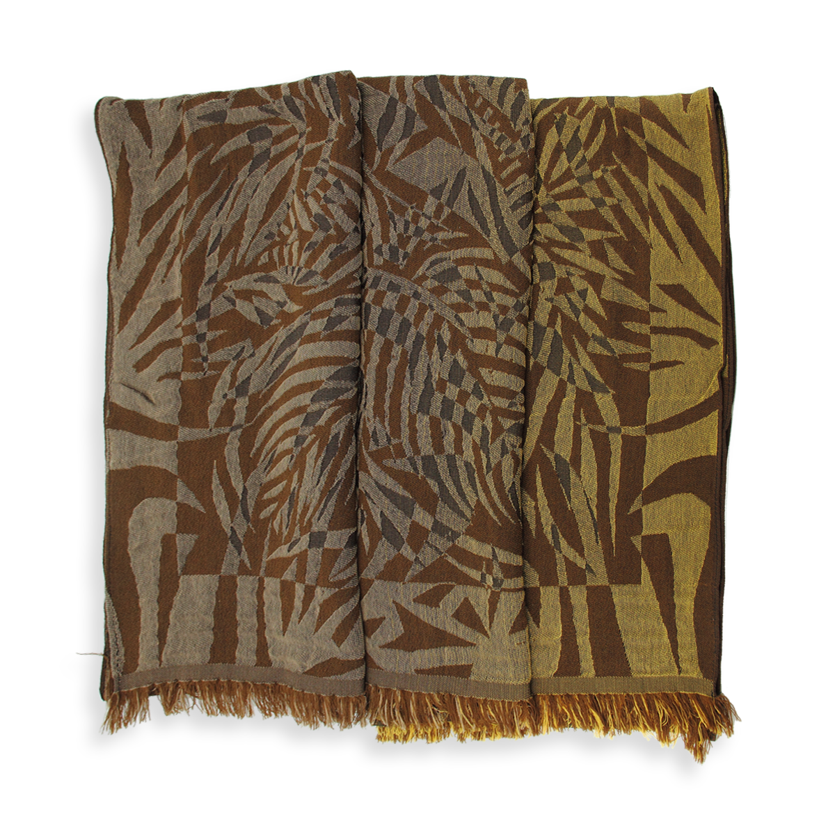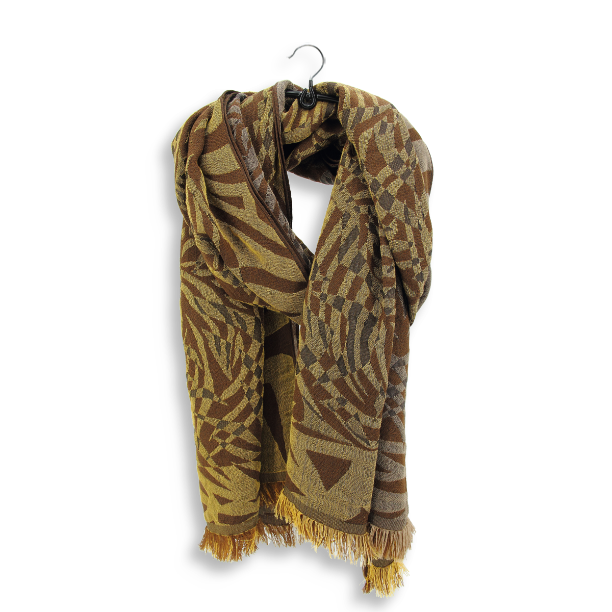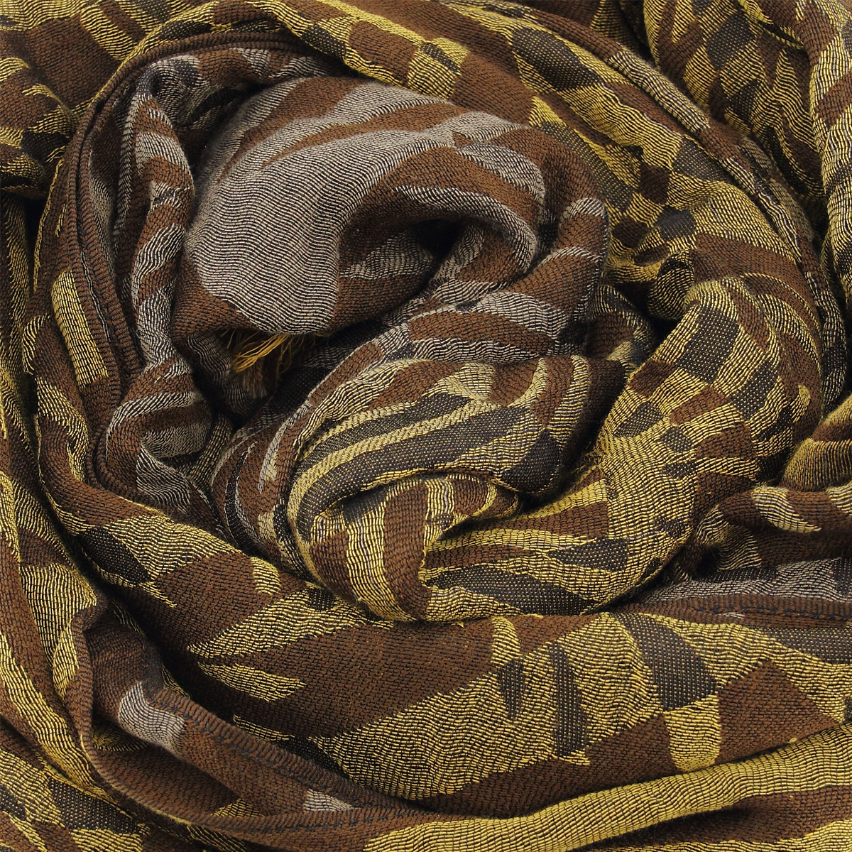 A very large stole made of natural materials: Merino wool, silk and cotton. A luxurious composition bringing you warmth, softness, and comfort (Merino wool does not itch). The color scheme is refined in brown, golden yellow and beige. Impeccable finishes with small 2/3 cm fringes at the base and a thin hem along the lengths. An original design by La Fabrique d'écharpe to give as a gift for Christmas or a birthday.