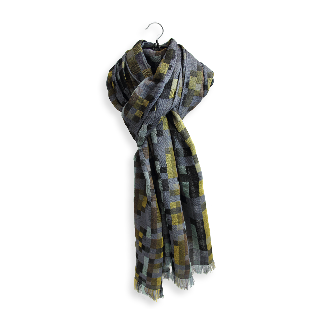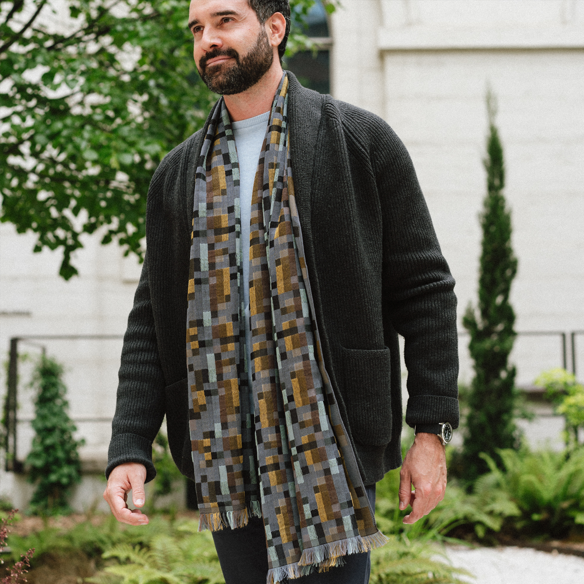 The weaving method used to make this scarf, known as the Jacquard method, involves the interweaving of a silk warp thread with a wool, cotton, and silk weft thread, using a specific pattern. In order to do this, the Fabrique d’Écharpe weaving atelier uses Jacquard looms. The Jacquard loom was developed by Lyon-native Joseph Marie Jacquard in 1801, who created the first mechanical system that could be programmed with perforated cards to create a design by interweaving different colored threads. Thanks to the artisan weaving knowledge transmitted to us from generation to generation since 1880, today we have electronically controlled looms that allow for the scarf to be produced with impeccable quality all while respecting the purest methods of traditional Lyon Jacquard weaving.