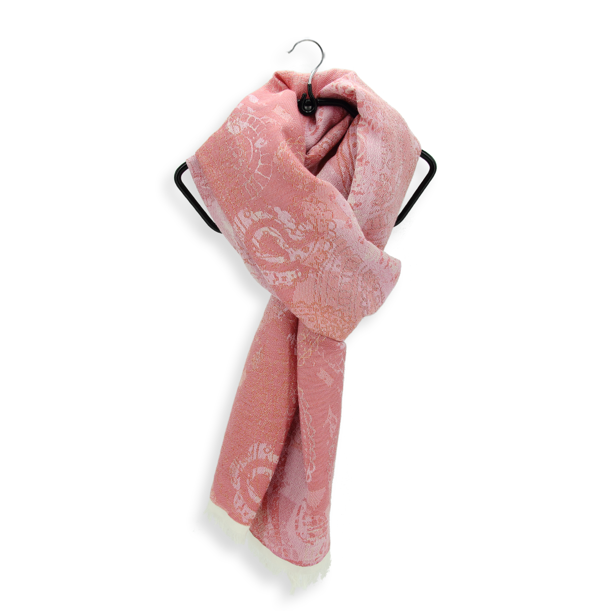The pattern is an original creation by La Fabrique d'écharpe. Several paisley, palm, and rosette designs intertwine, playing hide-and-seek. The Jacquard technique used to make this scarf adds a lot of texture to the fabric. The coloring is soft and subtle, making it easy to match with any style.